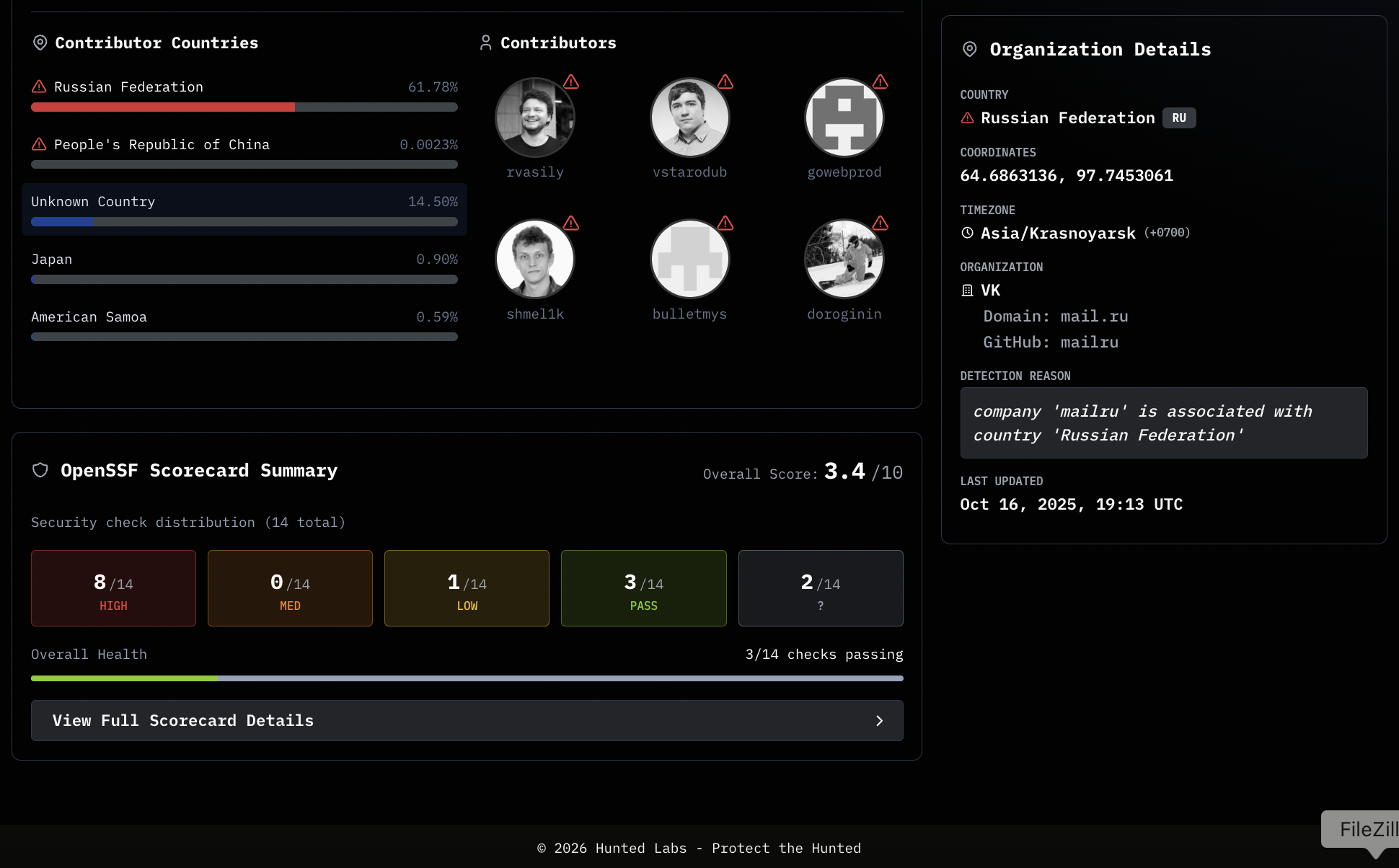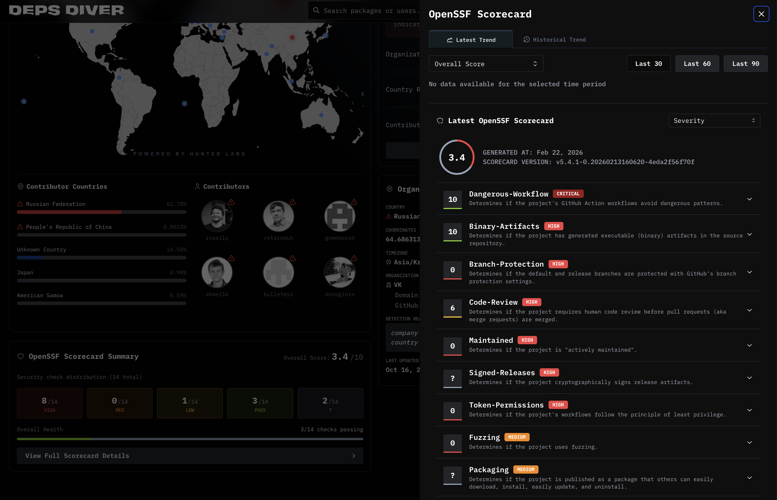 Try it out: As an example, try searching for easyjson in the go ecosystem. This package is a great example of adversarial foreign influence across both package ownership and contributors.