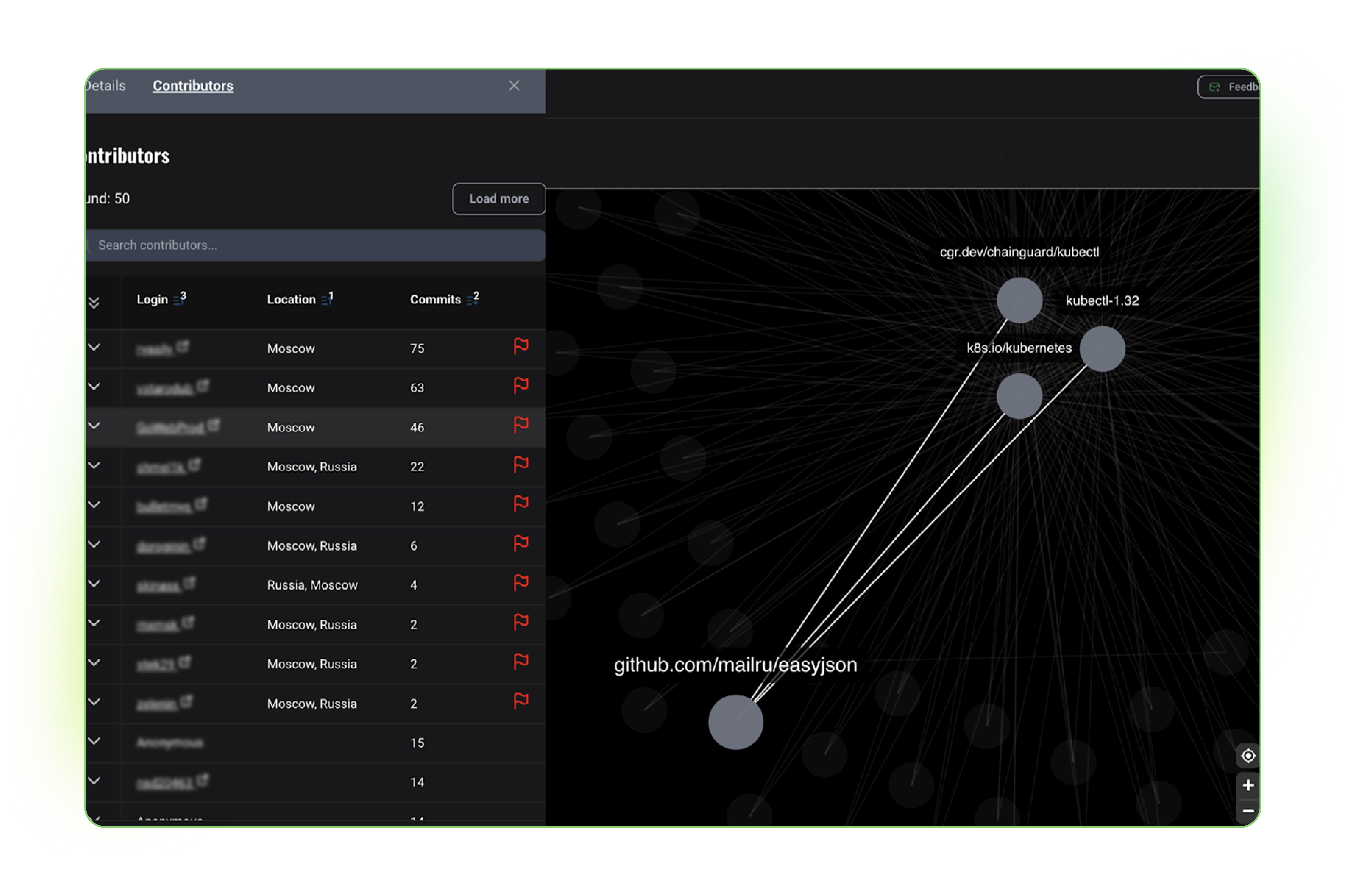 Entercept surfaced one dependency, named easyjson, with questionable origins and major potential impact if exploited, based on the massive footprint of contributions coming from Moscow. We then scanned various important open source projects using the Blast Radius component of our platform to visually explore various projects’ interconnectedness to easyjson. That’s when we started to see alerts light up our screen. We found extremely popular projects repeatedly impacted by easyjson.